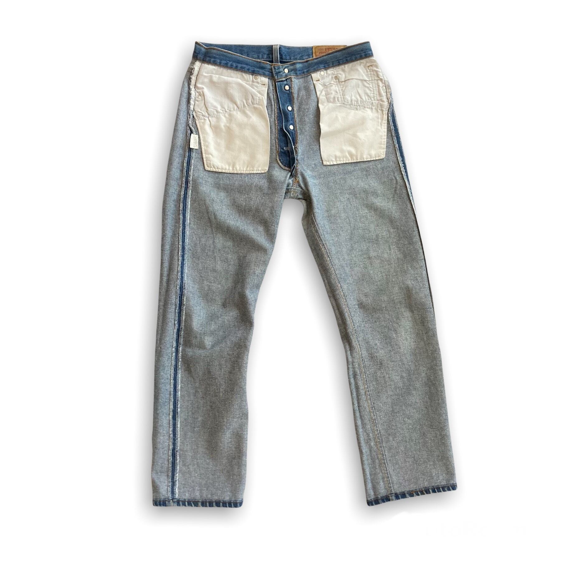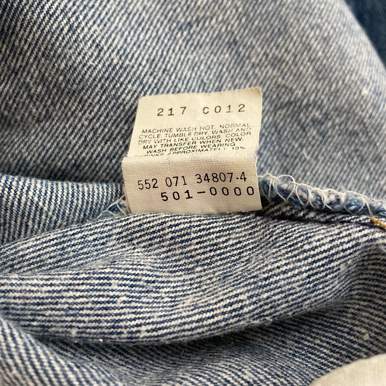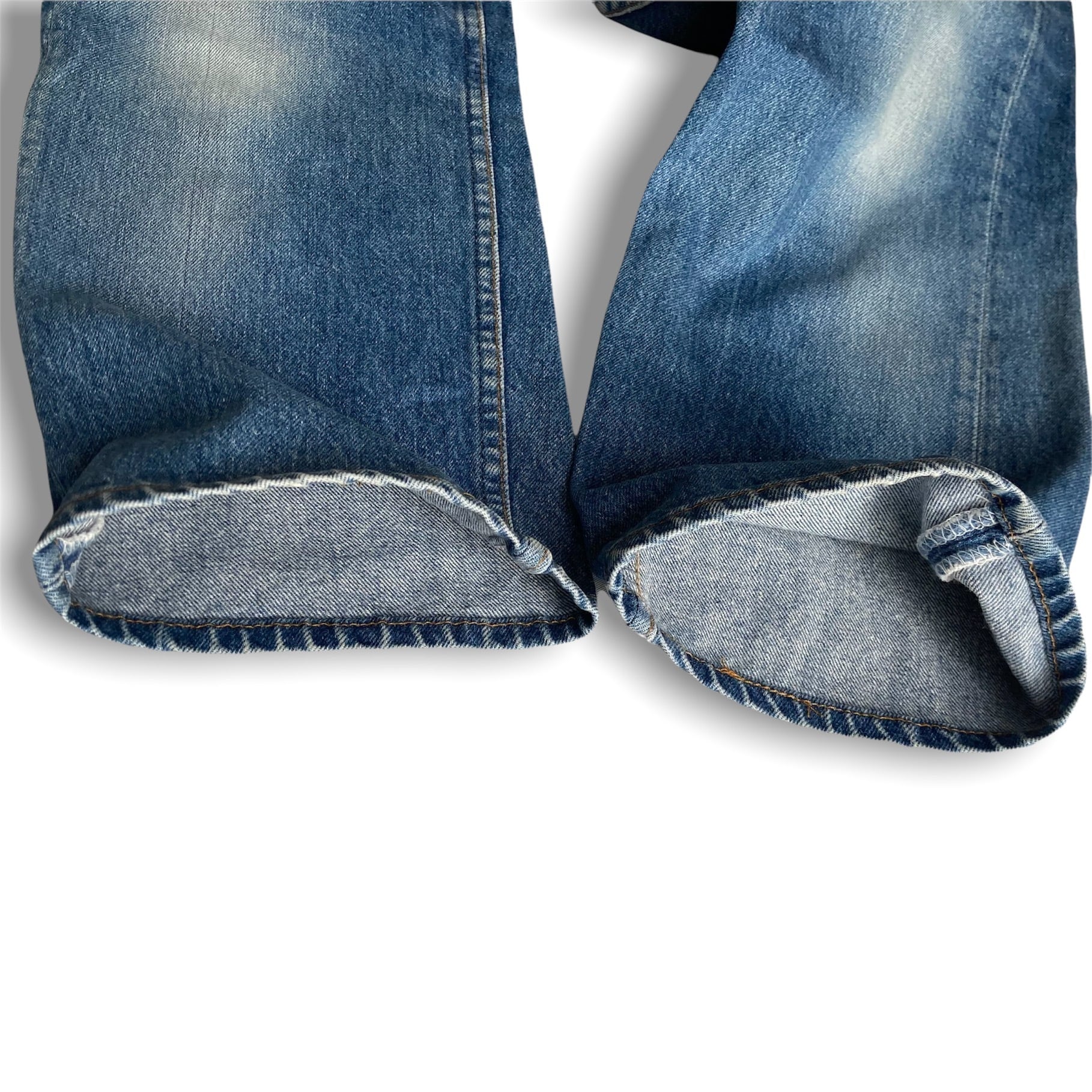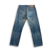 古いヴィンテージデニムの様な色落ちまではいきませんが、薄っすらとヒゲや蜂の巣が見られ、モモ〜ヒザにかけての薄いブルーに対して、スネの濃いブルーが残る濃淡のある色落ちは、前述の専門店向けの501だと推測致します。