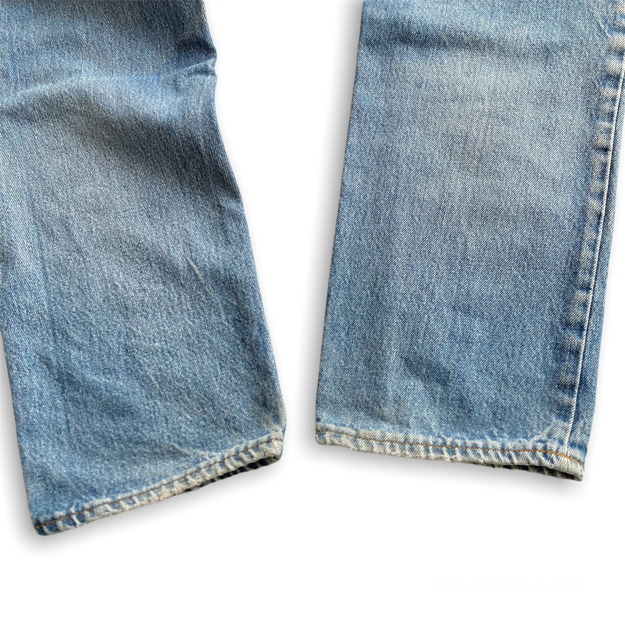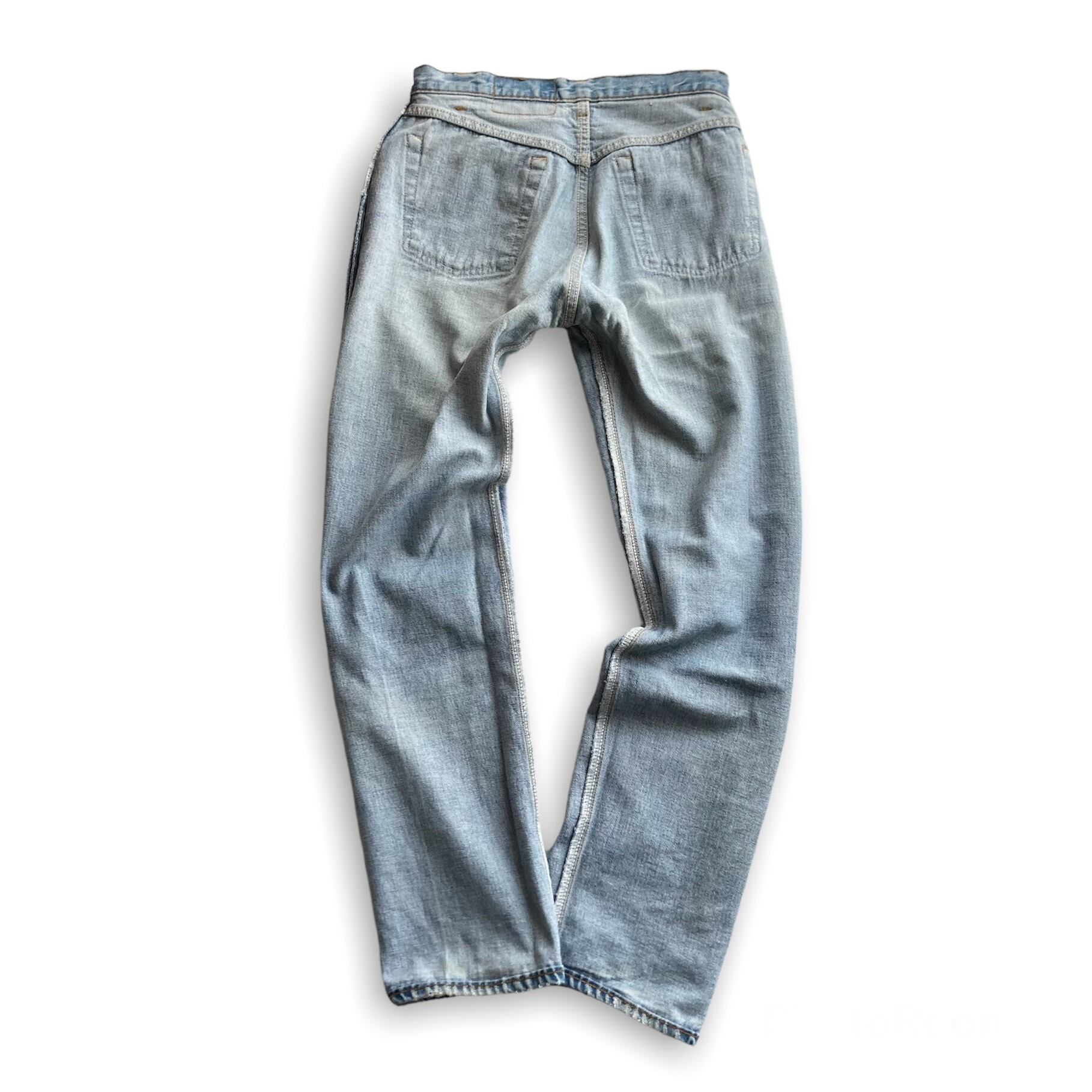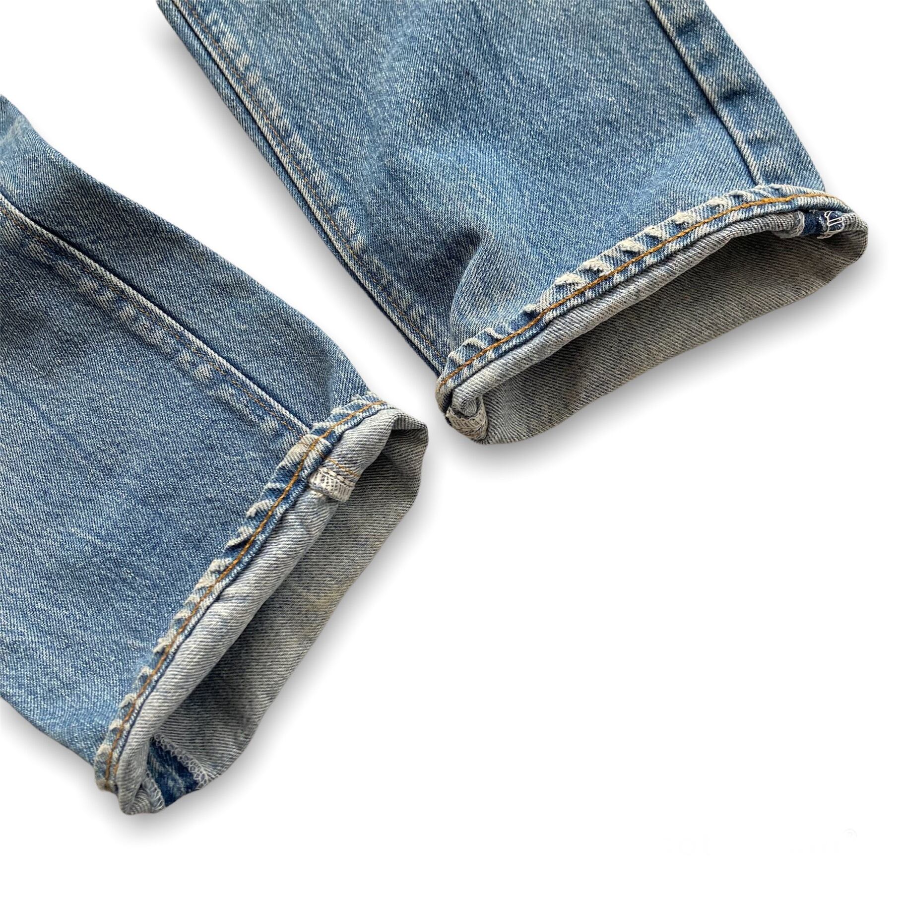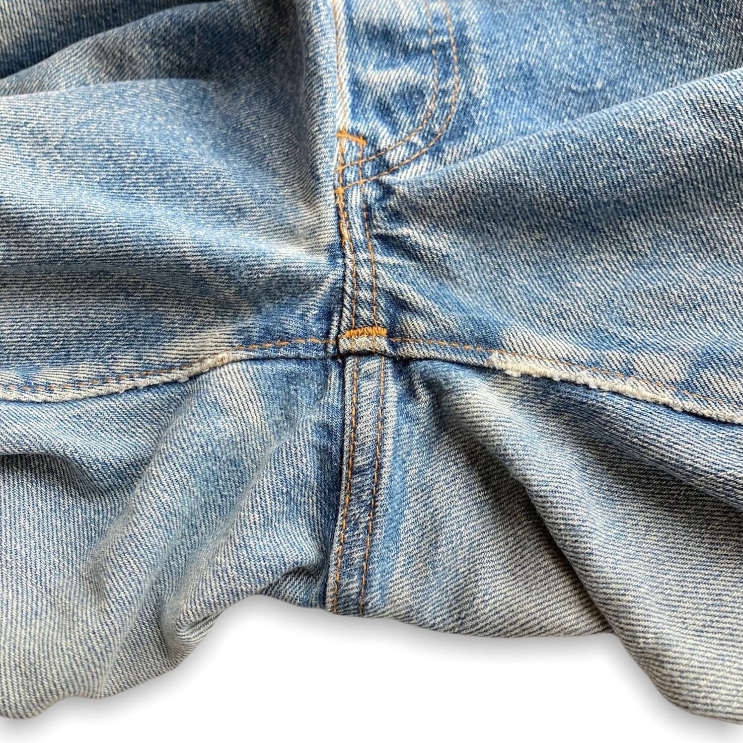 ダメージを受けやすい股部と裾部は、着用によるスレがありますが、穴などは無く裾はオリジナルのチェーンステッチです。