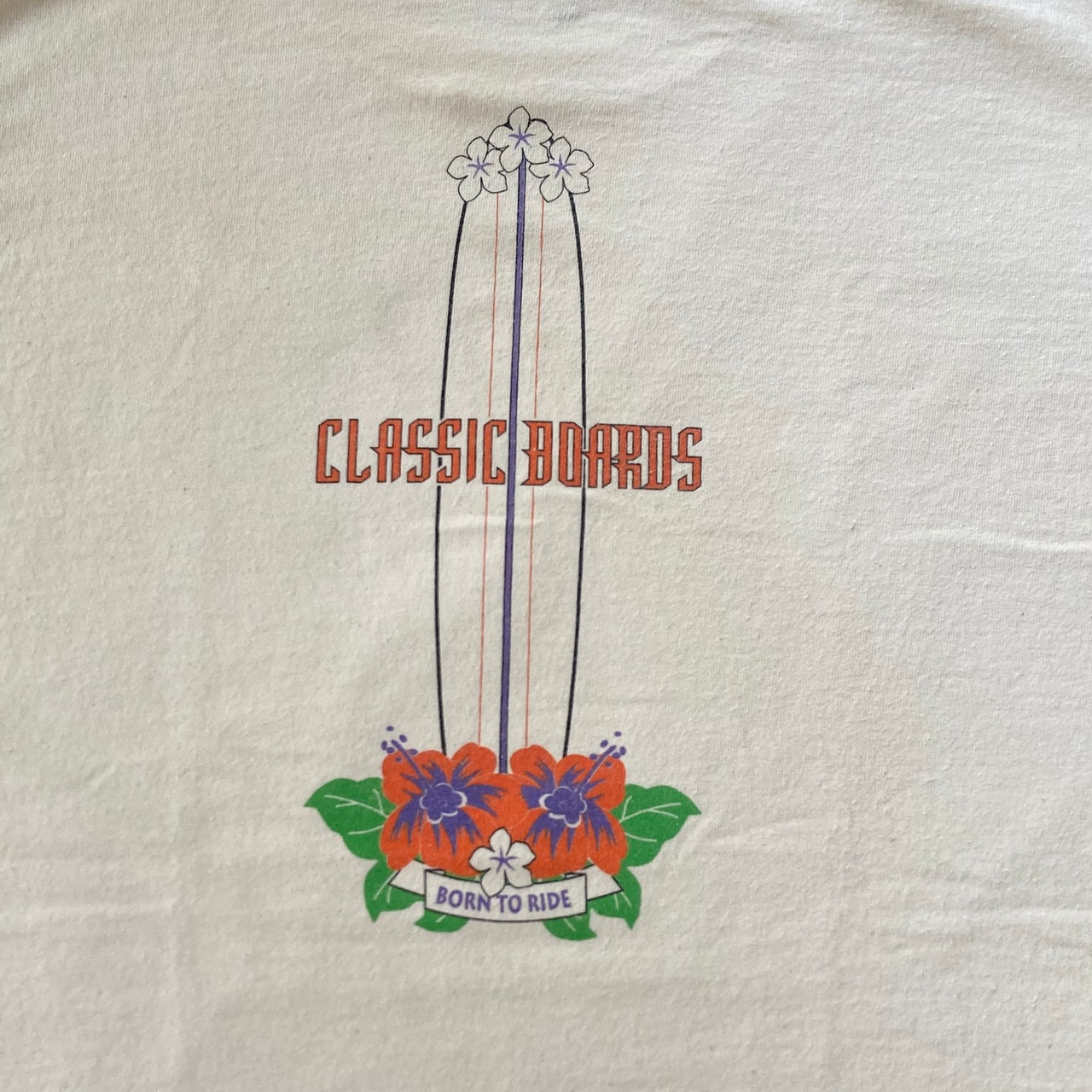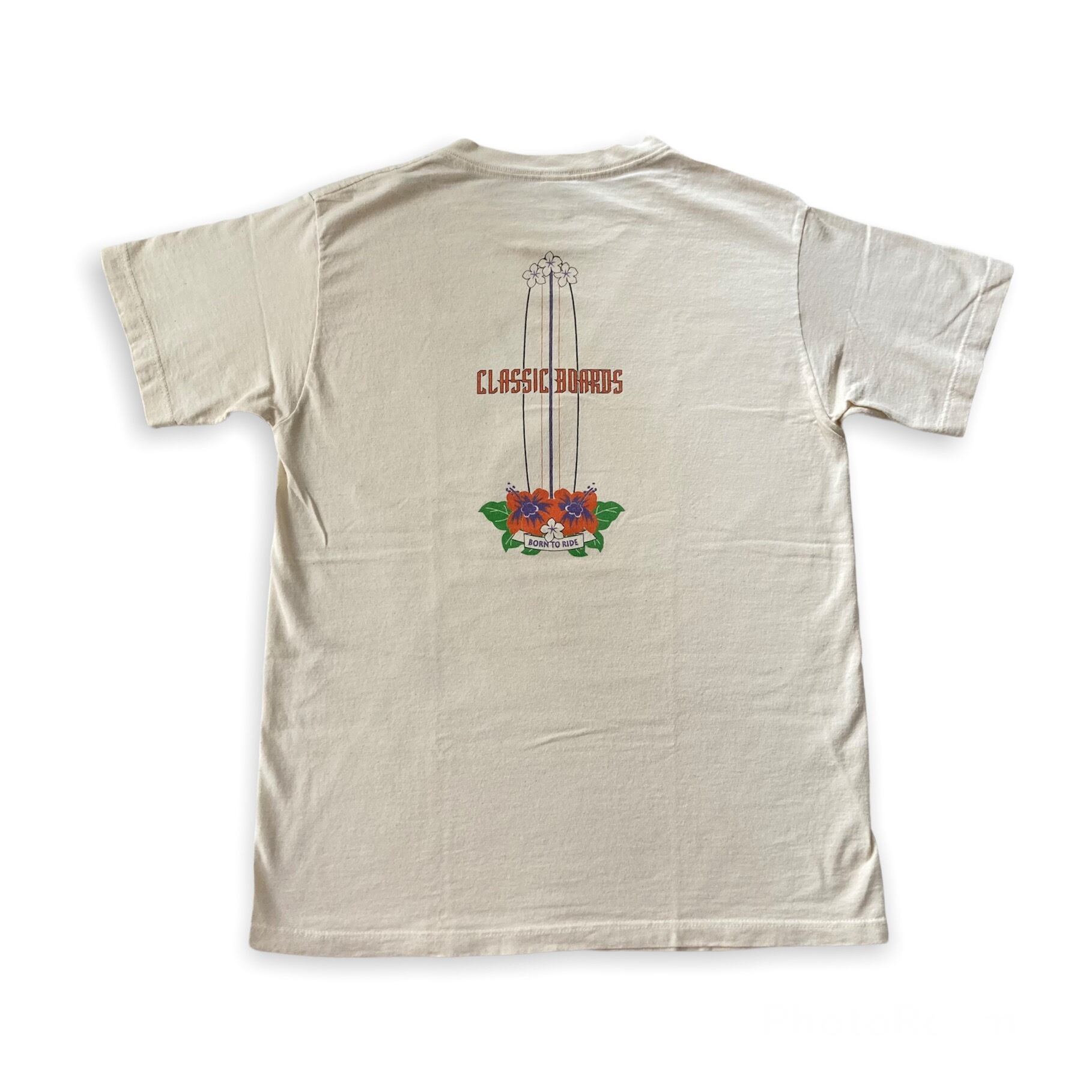 背中にロングボードとハイビスカス、プルメリアをモチーフにした実に南国らしいデザインがプリントされています。