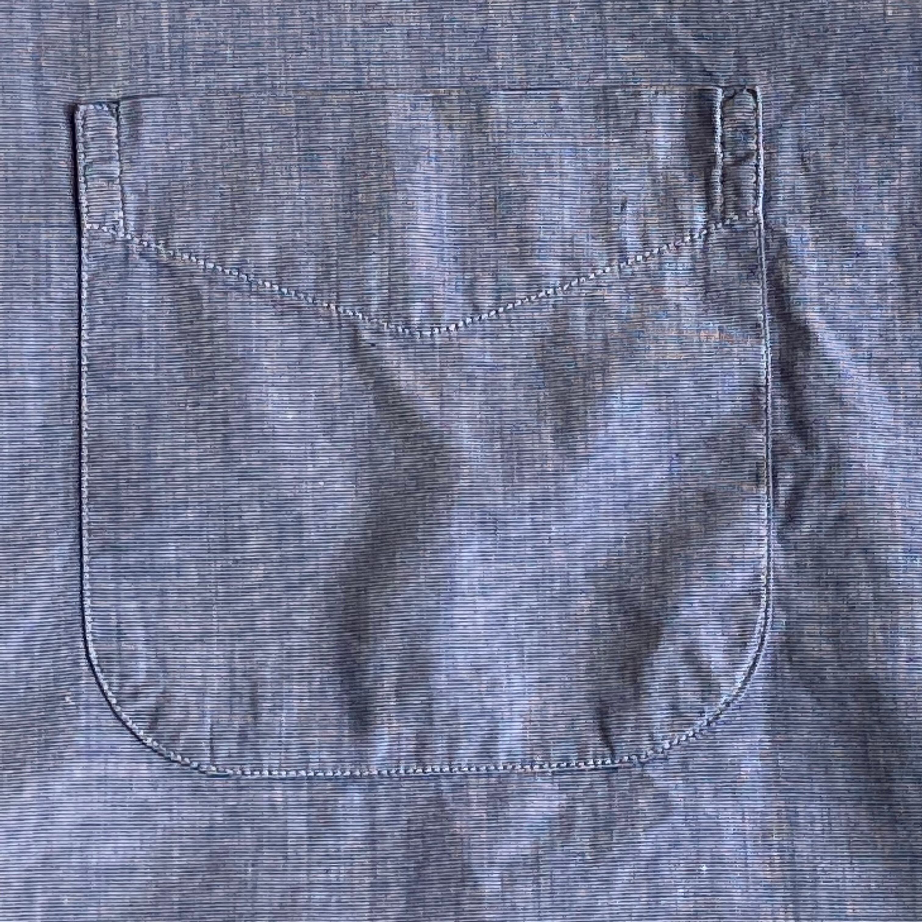 遠目に見ると、無地のブルーに見えるコットン100%の生地は、青と白の糸を1本おきに配列し、横糸も同じ色糸の配列で織り込んだ平織りの生地です。