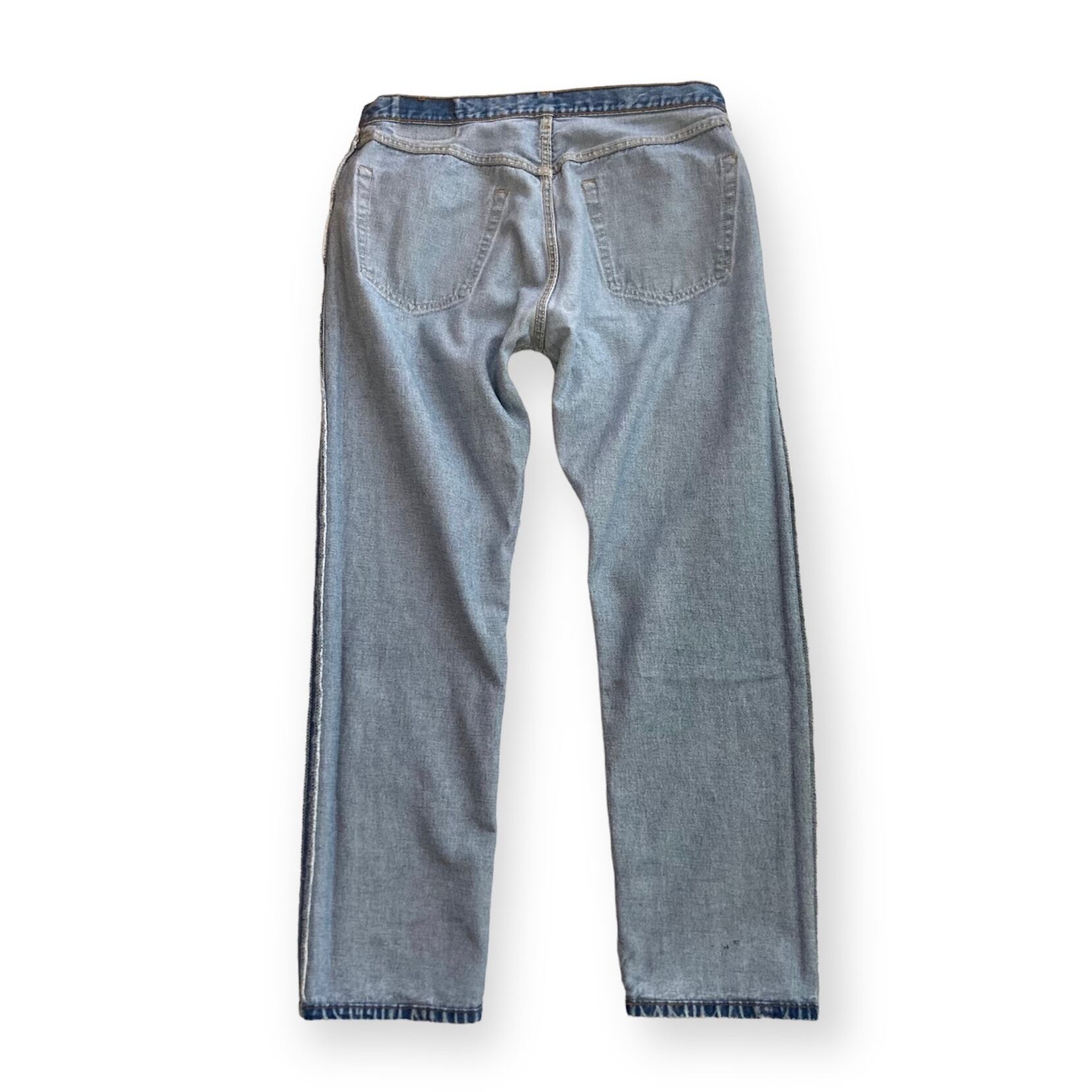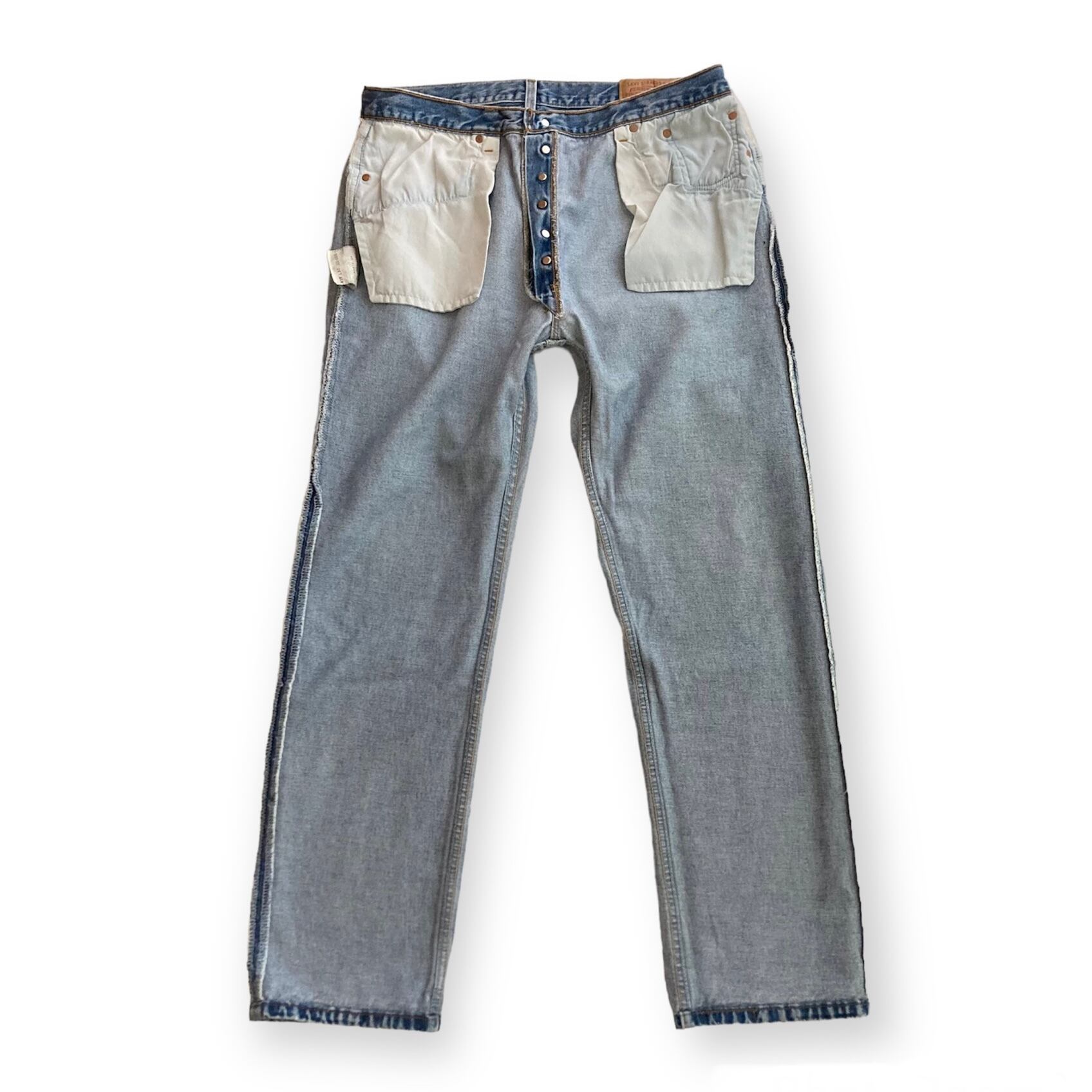 古いヴィンテージデニムの様な色落ちまではいきませんが、モモ〜ヒザにかけての薄いブルーに対して、スネ〜裾にかけて濃いブルーが残る濃淡のある色落ちは、前述の専門店向けの501だと推測致します。