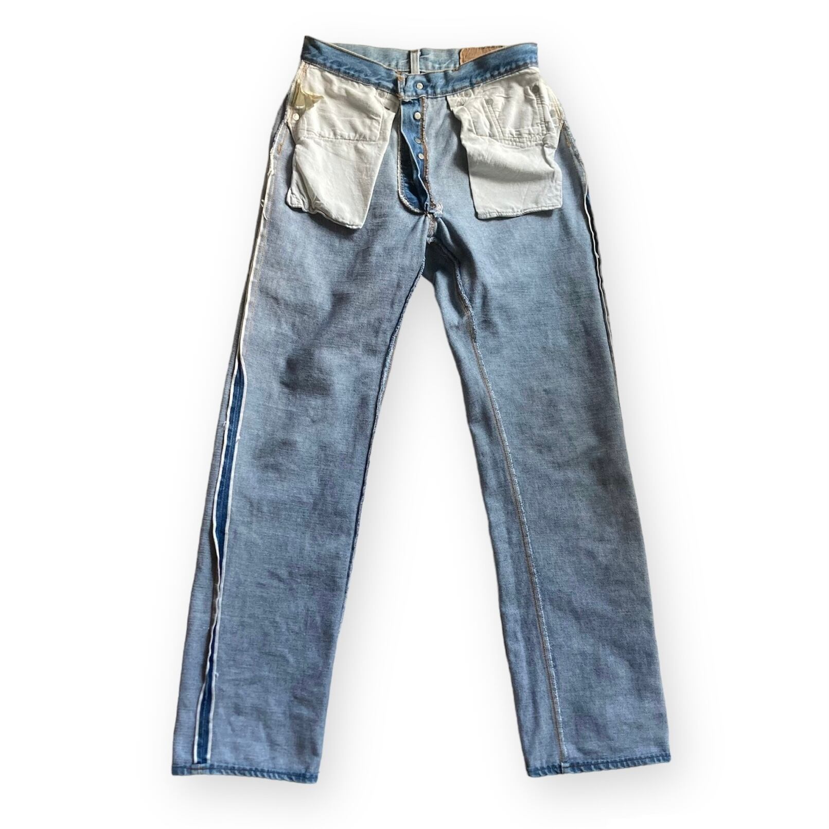 紙パッチは、古着のLevi'sによく見られる擦れがあり文字が消えかかった状態で、トップボタン、フライフロントのボタンホールに若干ほつれがありますが、現状ボタンで留められます。