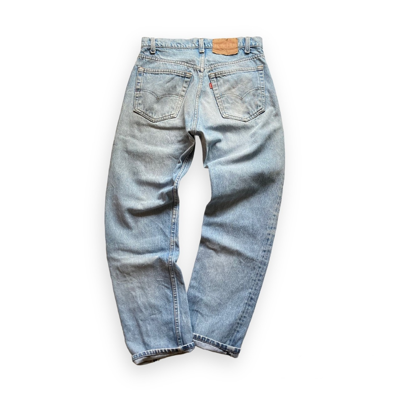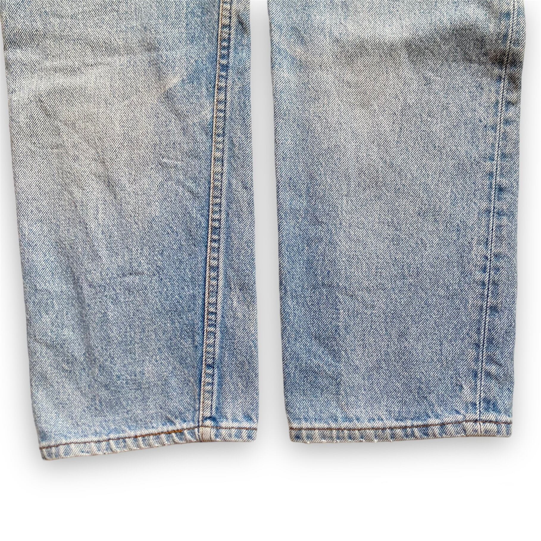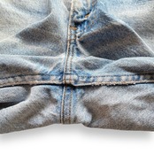 より古いヴィンテージデニムの様な色落ちまではいきませんが、モモ〜ヒザにかけての薄いブルーに対して、スネ〜裾にかけて濃いブルーが残る実に80年代らしい濃淡のある色落ちが魅力です。