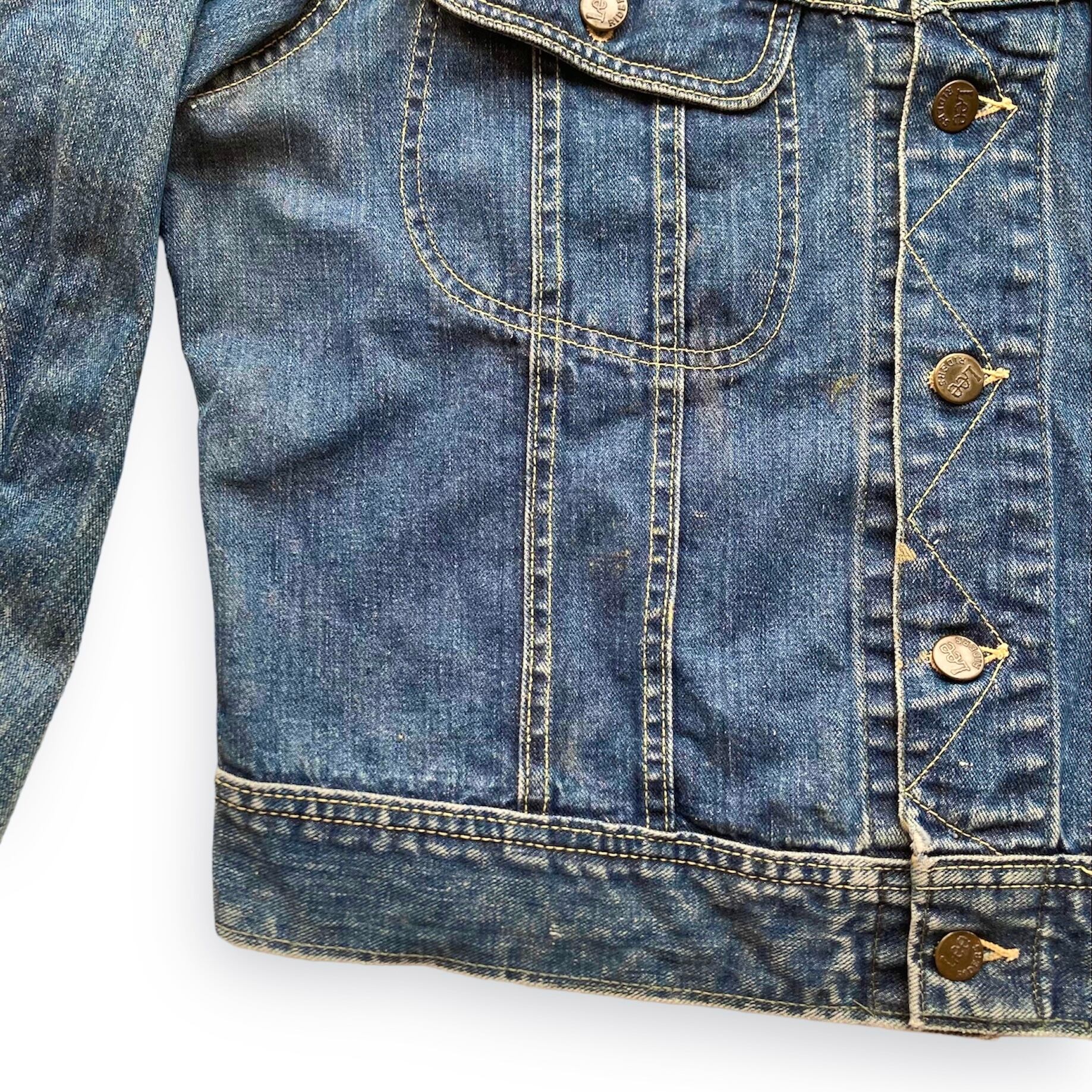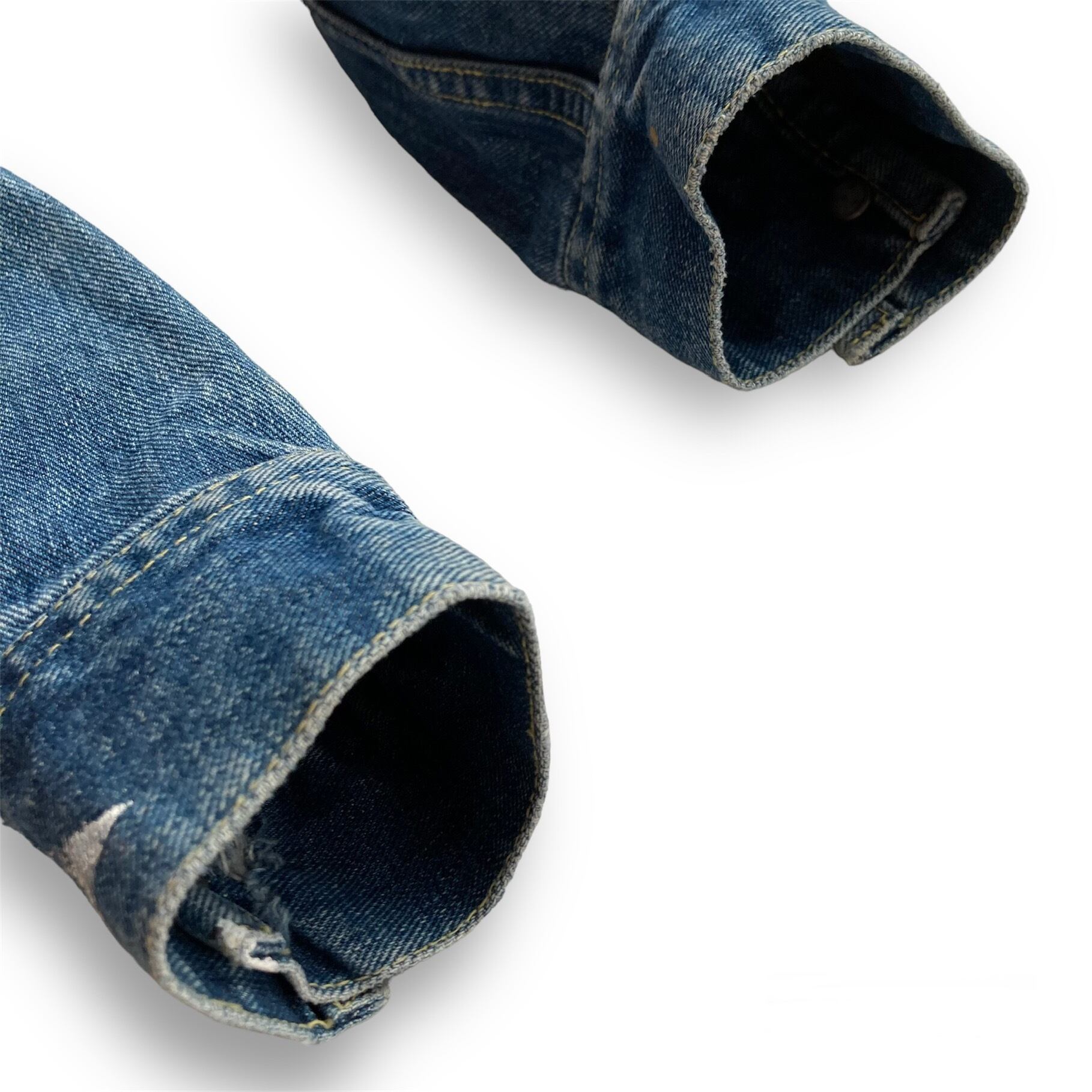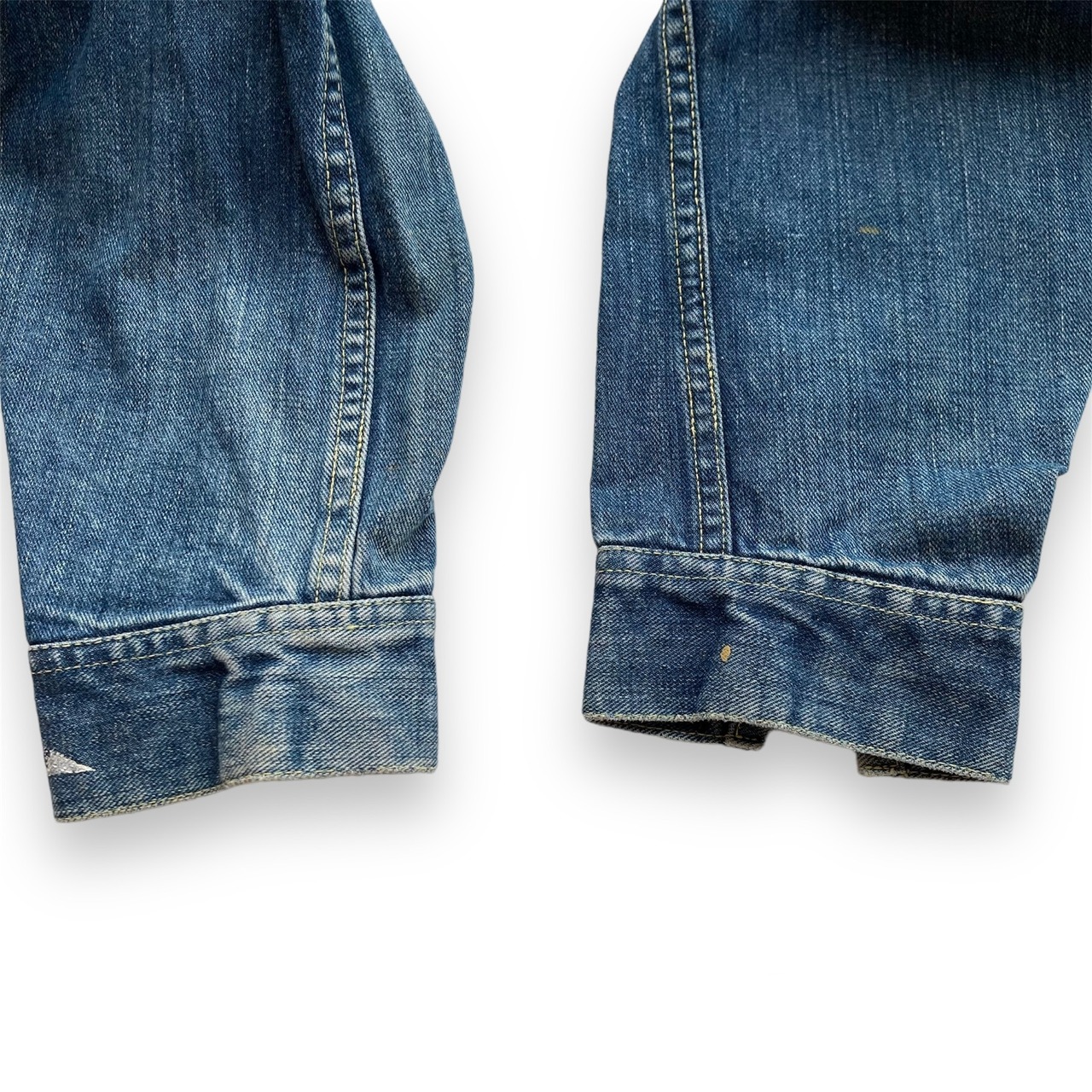 右カフに白ペンキ?汚れや前タテ、左袖など各箇所にペンキ?などの汚れがありますが、古着のデニムジャケットによく見られる襟や袖口に擦り切れなどの穴は無く、全体的に綺麗なコンディションを保っています。