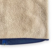 内側の第一層は、吸湿性に富み伸縮性があるキャプリーン加工済みのレイヤー、中間層の第二層目は、P.E.F.(防風性能強化フィルム)、外側の第三層は、保温性が高く毛足が長い1/4インチのフリースからなる複合素材です。